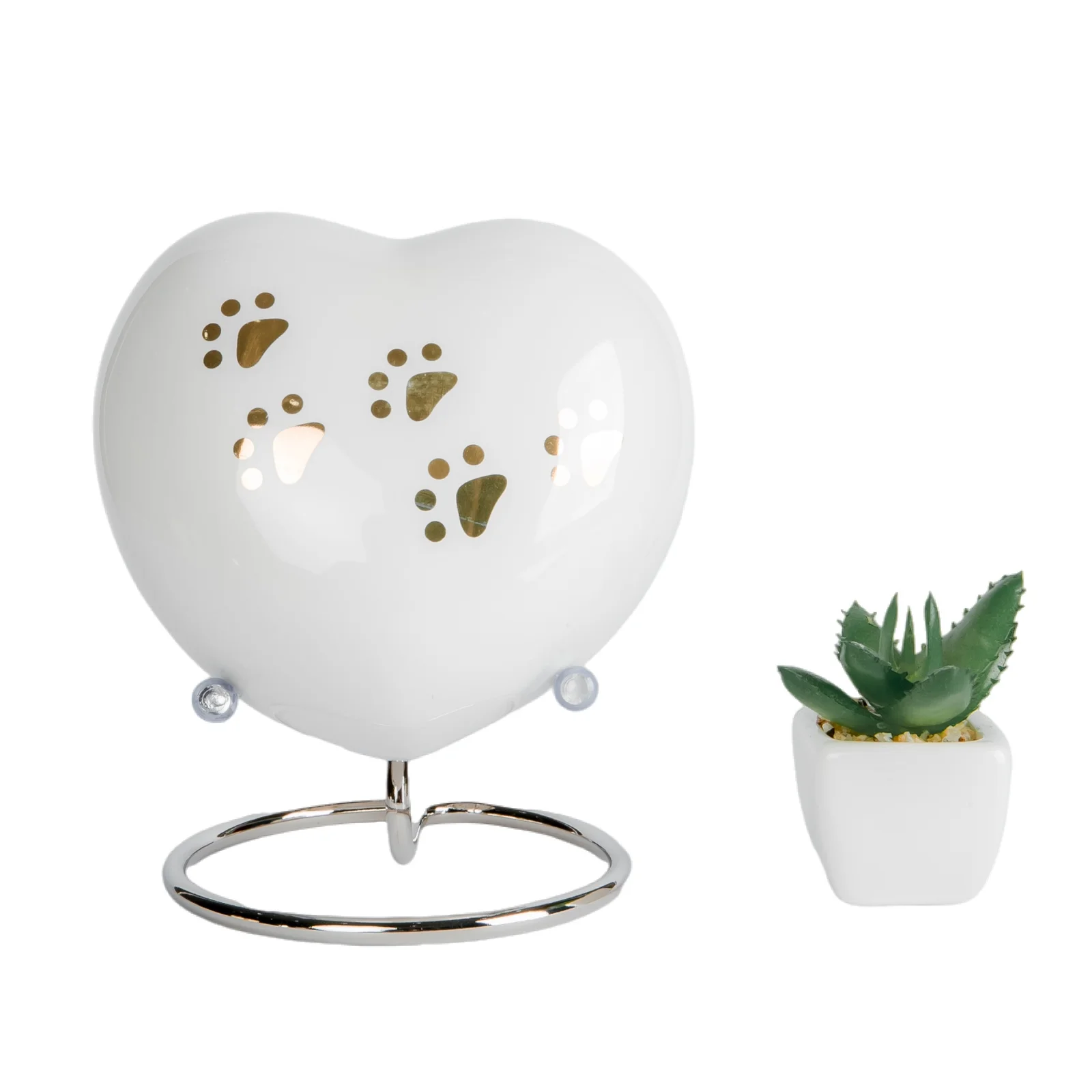 This classic heart pet cremation urn has a soft white finish, decorated with a paw print and heart design—symbolizing loyalty and love. It’s handcrafted from durable ceramic and designed to bring comfort while blending seamlessly into your home decor.